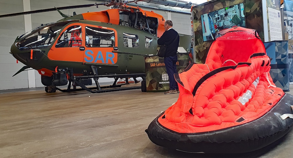 Weitere Hubschrauber finden sich in der Halle B5. Hier präsentiert sich das Hubschraubergeschwader 64 der Luftwaffe mit dem schweren Transporthubschrauber Sikorsky CH-53GA. Auch ein Airbus Helicopters H145M in der Version LUH SAR (Light Utility Helicopter Search and Rescue), den das Transporthubschrauberregiments 30 der Heeresflieger für den Such- und Rettungsdienst einsetzt, ist mitsamt der Besatzung vor Ort. Wie der SAR-Dienst in der Bundeswehr organisiert ist, welche Aufgaben über Land und See wahrgenommen werden und wie die Einsätze koordiniert werden, ist hier ebenfalls zu erfahren.