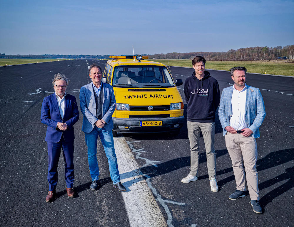 Wollen den Elektroflug als Alternative zum Auto am Twente Airport etablieren: (v.l.n.r.) Gerben Groothuis und Jan Schuring (Twente Airport), Thijs Bosgoed (Lucy) und Robbert Jan Kooij (Oost NL). © Alice
