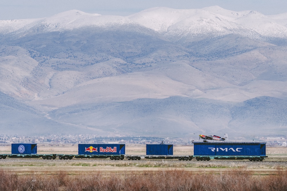 Stunt gelungen. Mit einem Vorbeiflug am Zug verabschiedet sich der Pilot. © Mahmut Cinci / Red Bull Content Pool