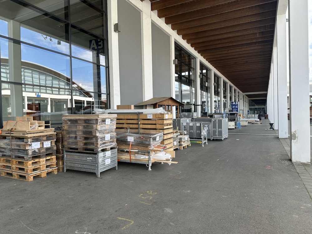 In dem Innenhof zwischen den A- und den B-Hallen des Messegeländes stapeln sich noch haufenweise Kisten. LKW stehen und entladen weiteres Material und holen entleerte Verpackungen wieder ab. Bis Montag Abend sind sie vom Messegelände verschwunden, dann gehen Putzkolonnen durch die Hallen und säubern die Gänge. Die Aussteller entfernen danach die Schutzfolien von den Bodenbelägen, die AERO kann beginnen.Â