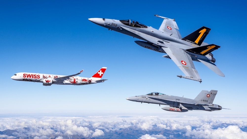 Formationsflug mit Flugzeugen so unterschiedlicher Größe wie der A350-900 und der F/A-18 Hornet ist kein triviales Unterfangen. © VBS / Schweizer Luftwaffe / Christian Lucek
